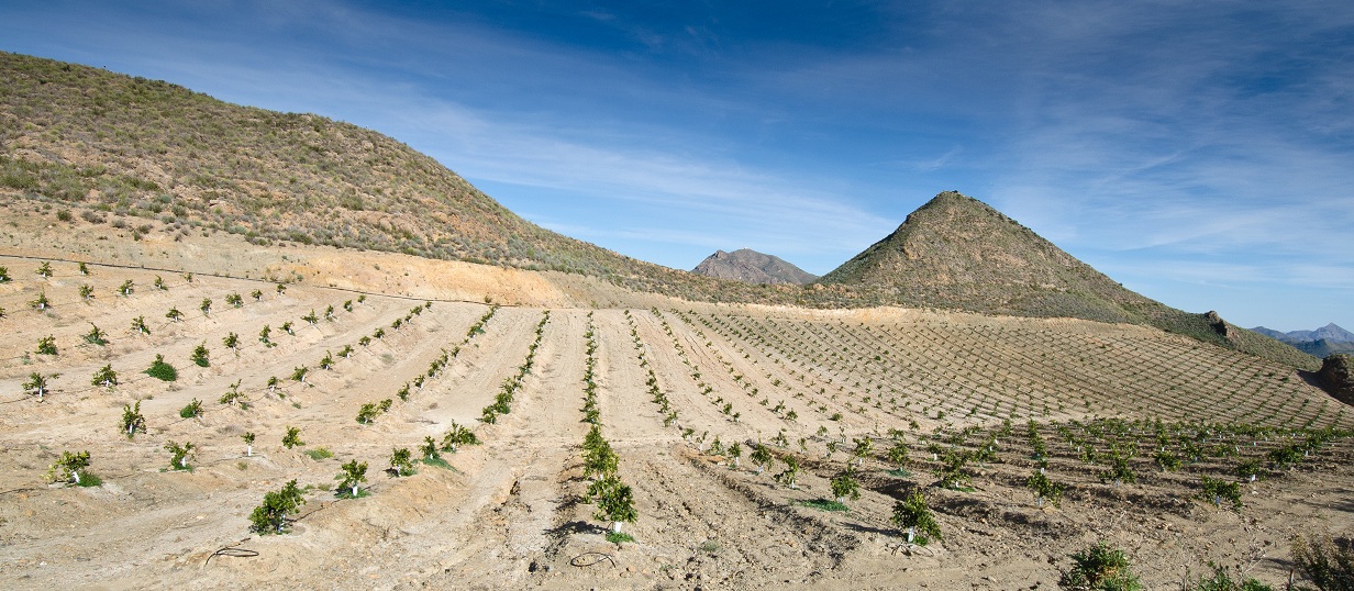 Para comprender el segundo ejemplo, os pongo en situación, se trata de la Sierra de Almenara, una sierra prelitoral de la Región de Murcia, semidesértica, sin agua y cubierta con un manto de matorral bajo; el recorrido por sus carreteras secundarias y caminos nos muestra un medio hostil, árido, difícil…. de repente pasamos una curva y vemos como el monte bajo se ha desbrozado, la pendiente se ha modificado y ahora tenemos una plantación de cítricos (propia de zonas de regadío)…. ¿Qué nos está contando el paisaje de sus habitantes?